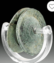 - Greece, Hellenistic Period, ca. 3rd to 1st century BCE. A fine and rare pair of bronze finger cymbals called krotala (singular krotalon) used by female or dwarf dancers and performers (called krotalistriae). Each krotalon is constructed from a flat sheet of bronze that is mold-cast with a concave body, an upturned rim, and protruding central kick with a petite perforation. The tops of the cymbals are adorned with a series of raised concentric rings that form a minimalist bullseye motif. Krotala like these would have been suspended to the dancer’s forefinger and thumb via twisted strands and struck rhythmically to create a bright ringing sound; the concave body and flared rim enabled the elongated reverberation of the sound created. Fine patina has enveloped both instruments. Similar to the modern Spanish castanet, krotala were often played ceremonially during certain events. Size of each (both are relatively similar): 2.1″ Diameter (5.3 cm); 4.75″ H (12.1 cm) on included custom stand.