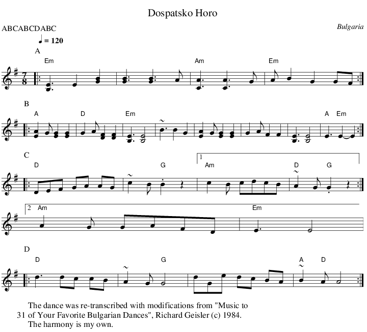 Excerpt from Folk Dance Problem Solver ©1997 by Ron Houston “According to all Bulgarian sheet music and to Rosen Toshov’s book [Akro Taktovi: Eseta (Sofia, 1994)] Dospatsko has an 8/8 rhythm of slow, quick, slow, counted 1-2-3, 4-5, 6-7-8. Contemporary arrangements, however, present the rhythm as 7/8 (slow, quick-quick), perhaps confusing it with the more common lesnoto rhythm of Macedonia to the southwest.