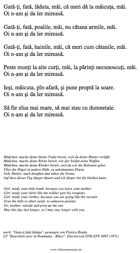There are MANY melodies and songs (with lyrics) labeled Hora Miresei (bride’s hora). One of the most popular in Romania is a song called Nuneasca (wedding dance, godparent’s dance), which is also the name of a wedding dance. Both songs accompany both dances. Below is sheet music and below that are YouTubes of Hora Miresei & Nuneasca. None of the YouTubes match any of the sheet music!