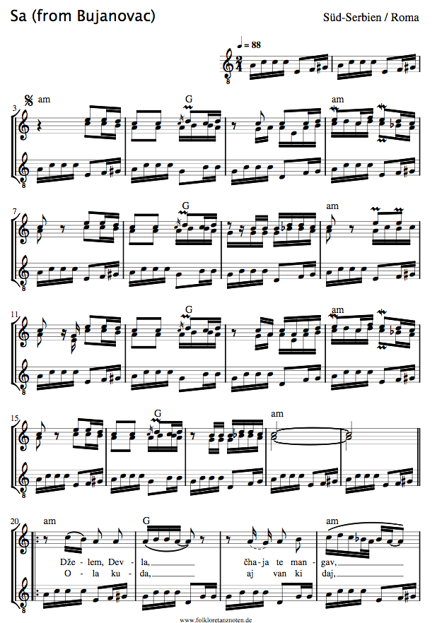 Sa, Sa-sa – Sheet music Anyone have a YouTube or mp3 of this music? Can be downloaded here: http://www.folkloretanznoten.de/Sa2.pdf Dzlem, Devla (Sa from Bujanovac) Can be downloaded here: http://www.folkloretanznoten.de/Sa1.pdf Can be downloaded here: http://www.folkloretanznoten.de/SkopskiSaSa.pdf Share this: Click to share on X (Opens in new window) X Click to share on Facebook (Opens in new window) Facebook Like Loading...