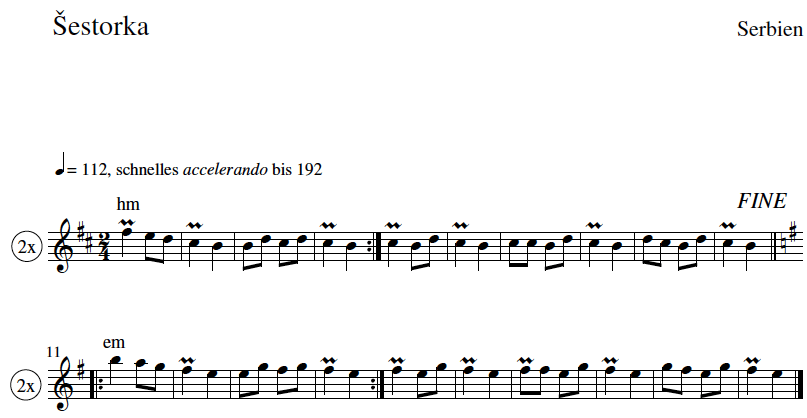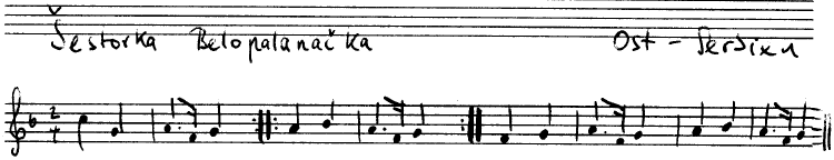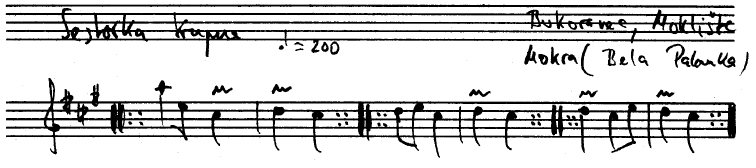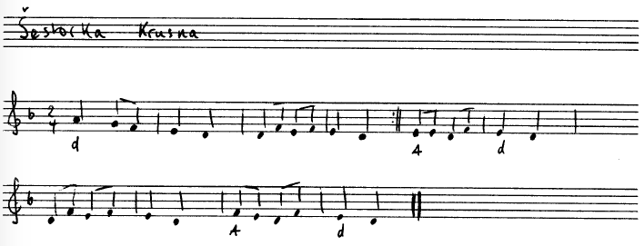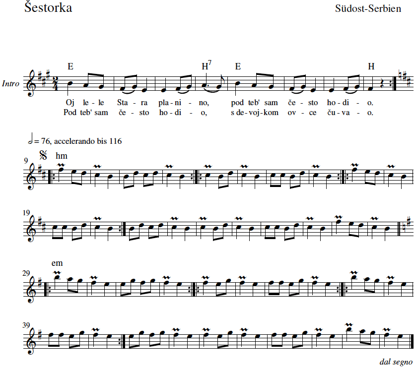 Šestorka (Oj, lele Stara planino) – Sheet Music https://www.youtube.com/watch?v=VfvMKV1BTEM This is the song that originally started the dance. Nowadays, it seems mostly to be left out. All sheet music easily downloaded at this site: http://www.folkloretanznoten.de/serbisch-serbian/ This is the 14-measure instrumental that used to follow the song, but now is used exclusively. 14-measure pattern. Šestorka Krusna, 14-measure pattern 16-measure pattern Šestorka sitna, 16-measure pattern. On Folkraft LP54 B5. Šestorka bela palanka, 12-measure pattern Šestorka krupna, 12×2-measure On Folkraft LP54 B4. Share this: Click to share on X (Opens in new window) X Click to share on Facebook (Opens in new window) Facebook Like Loading...