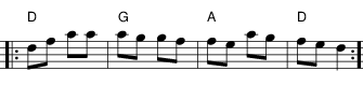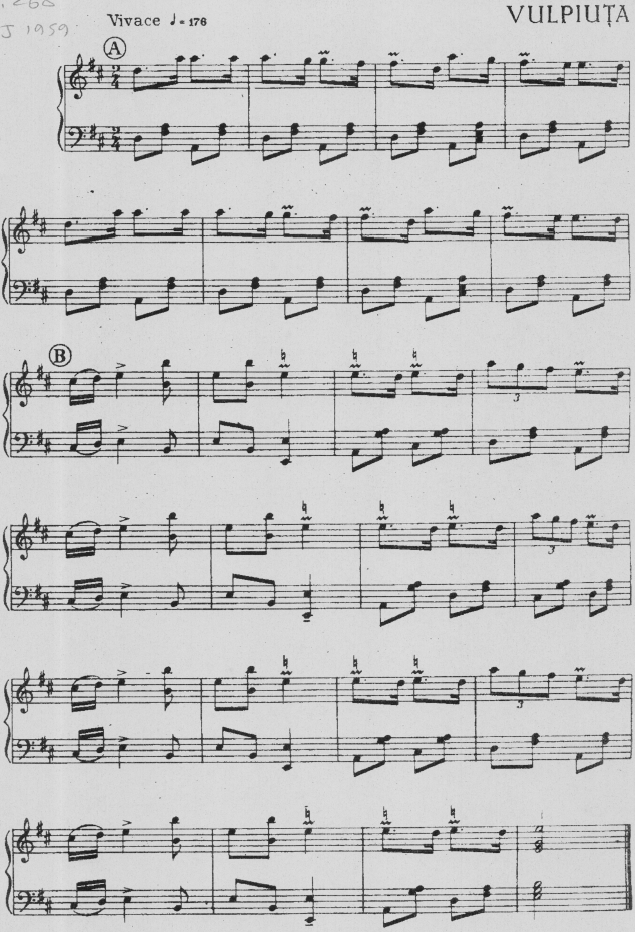 Vulpiuță as published in Romania, 1959 by Popescu-Județ. A has 8 measures, B has 16. In his accompanying dance, A has 8 measures, B has 12.